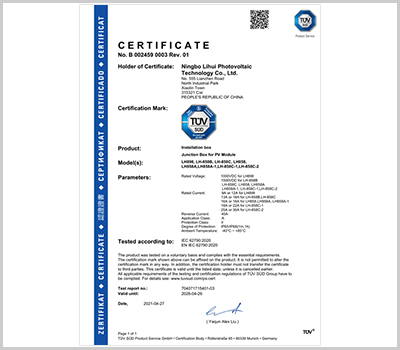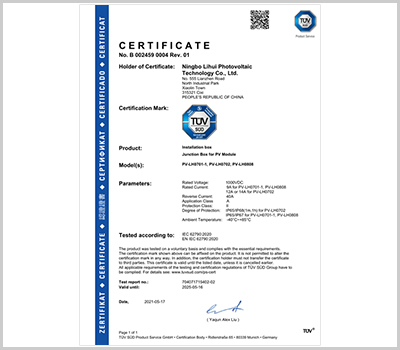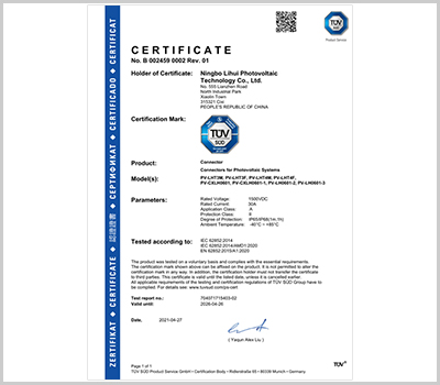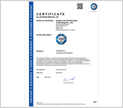 丽辉光伏结合10多年连接器生产管理的经验,企业通过了ISO9001等体系认证,同时我们拥有标准现代化厂房,并配备各种自动化生产设备、先进检测设备,依托多个知名的认证服务商,产品通过TUV等认证,目前我们接线盒日产量达到9万套。我们产品具备:品种多、设计新颖、市场覆盖区域性广等特征,产品备受国内外各地知名光伏组件制造商的指定和认可,目前我们的光伏接线盒、光伏连接器已经在多个地区的光伏系统、光伏电站起到了连接和保护作用,丽辉为您提供专业光伏连接解决方案!